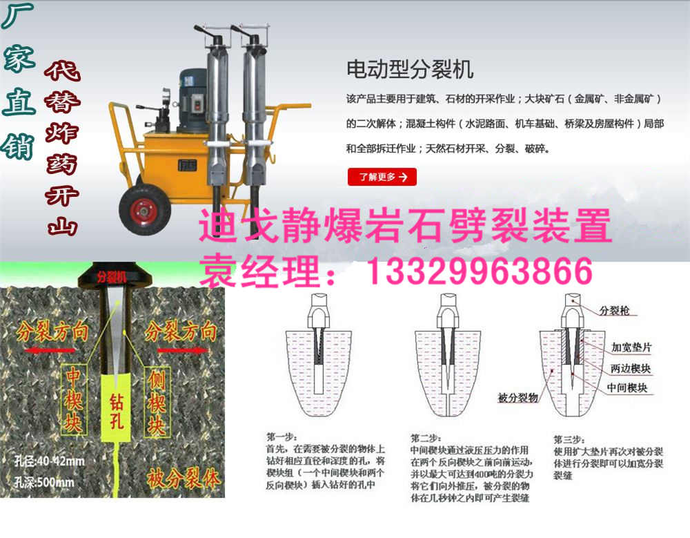 寧波市大型機載靜爆裝置替代風鎬炮擊輕松分裂巖石鋼筋混凝土 咨詢熱線:133*2996*3866 袁經(jīng)理 QQ:632391726 湖北迪戈科技有限公司產(chǎn)品適用于礦山開采中巖石分裂、采石場石料的二次分解、洞采礦石的巷道無爆破掘進,工程施工中要求不能使用爆破爆破的項目,如城市建筑的巖石基坑開挖、公路邊坡巖石的修整、景區(qū)基建平臺的巖石破碎、公路隧道免爆破掘進、地鐵隧道的開挖、橋梁孔樁、電塔基樁開挖等;公司產(chǎn)品在拆除鋼筋混凝土領域也有著獨到的作用,路橋工程中橋面鋪裝層的破拆,公路路基混凝土的拆除,房建剪力墻、承重梁、基礎樁等的破拆,效率是風鎬以及破碎錘的5~8倍。