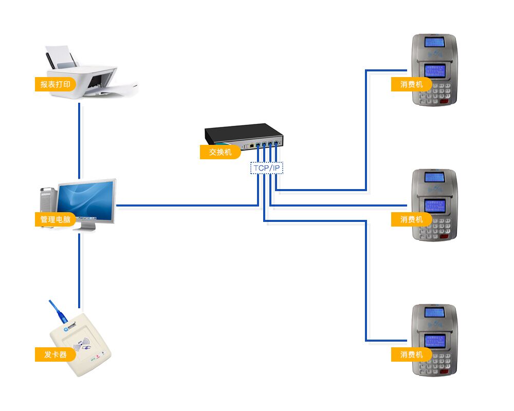 1. 一卡一密,雙重加密保護(hù)系統(tǒng)絕對安全 2. 30W 卡號超大容量 3. 最大支持 9999 臺設(shè)備 4. 最大支持 15W 交易金額 5. 485、TCP、GPRS 三種通信方式可選 6. 支持外接繼電器(可選) 7. 支持小票打印 8. 系統(tǒng)支持 LPT 收銀錢箱 9. 設(shè)備支持掃描槍(掃描菜單條碼) 10. 系統(tǒng)支持拍照功能 11. 系統(tǒng)支持自定義充值類型 12. 完善的積分管理功能 13. 支持 9 種交易模式(標(biāo)準(zhǔn)交易模式、定值交易模式、計次交易模式、計時交易模 式、時段交易模式、菜單交易模式、補貼機模式、充值機模式、退款機模式) 14. 系統(tǒng)支持計費卡、計次卡,現(xiàn)金金額、補貼金額、剩余次數(shù)獨立結(jié)算 15. 系統(tǒng)支持 15 種人員級別,不同級別對應(yīng)不同的折扣、費率、限制等信息 16. 系統(tǒng)支持每日限次、每日限額、時段限次、時段限額、時段外是否允許交易、卡 押金、單次限額、設(shè)備刷卡限制等限制信息 17. 系統(tǒng)支持實時采集設(shè)備數(shù)據(jù)(TCP、GPRS 模式下所有設(shè)備同步采集數(shù)據(jù)) 18. 系統(tǒng)支持實時監(jiān)控設(shè)備在線狀態(tài) 19. 系統(tǒng)支持實時監(jiān)控模式下自動提交掛失未完全人員,解掛未完全人員 20. 完善的報表中心 21. 友好的軟件界面,系統(tǒng)應(yīng)用導(dǎo)航讓你輕松使用 框架拓普圖: