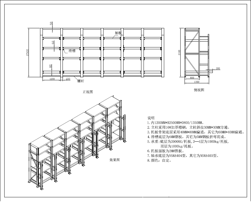 3、抽屜板可拉出65% 4、安全可靠附加保險裝置 5、操作輕便采用軸承組合,滑動平衡并附獨(dú)立吊模裝置 6、節(jié)省場地,占地面積積為1.8平方米,可存放幾十套中小型模具 7、結(jié)構(gòu)簡單,由多種組合部件組裝而成,便于拆卸、運(yùn)輸和組裝標(biāo)準(zhǔn)型抽屜式模具架技術(shù)參數(shù): 8. 立柱采用10#槽鋼,立柱斜杠為25*25方通 9. 抽屜板支架采用50*50角鐵,抽屜面板采用2MM鋼板 10. 滑槽為4MM鋼板折彎而成