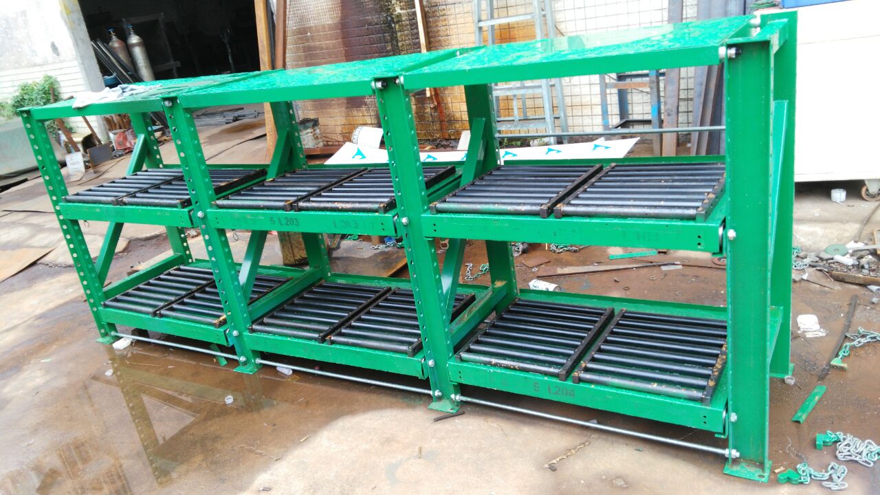 3、抽屜板可拉出65% 4、安全可靠附加保險(xiǎn)裝置 5、操作輕便采用軸承組合,滑動(dòng)平衡并附獨(dú)立吊模裝置 6、節(jié)省場(chǎng)地,占地面積積為1.8平方米,可存放幾十套中小型模具 7、結(jié)構(gòu)簡(jiǎn)單,由多種組合部件組裝而成,便于拆卸、運(yùn)輸和組裝標(biāo)準(zhǔn)型抽屜式模具架技術(shù)參數(shù): 8. 立柱采用10#槽鋼,立柱斜杠為25*25方通 9. 抽屜板支架采用50*50角鐵,抽屜面板采用2MM鋼板 10. 滑槽為4MM鋼板折彎而成