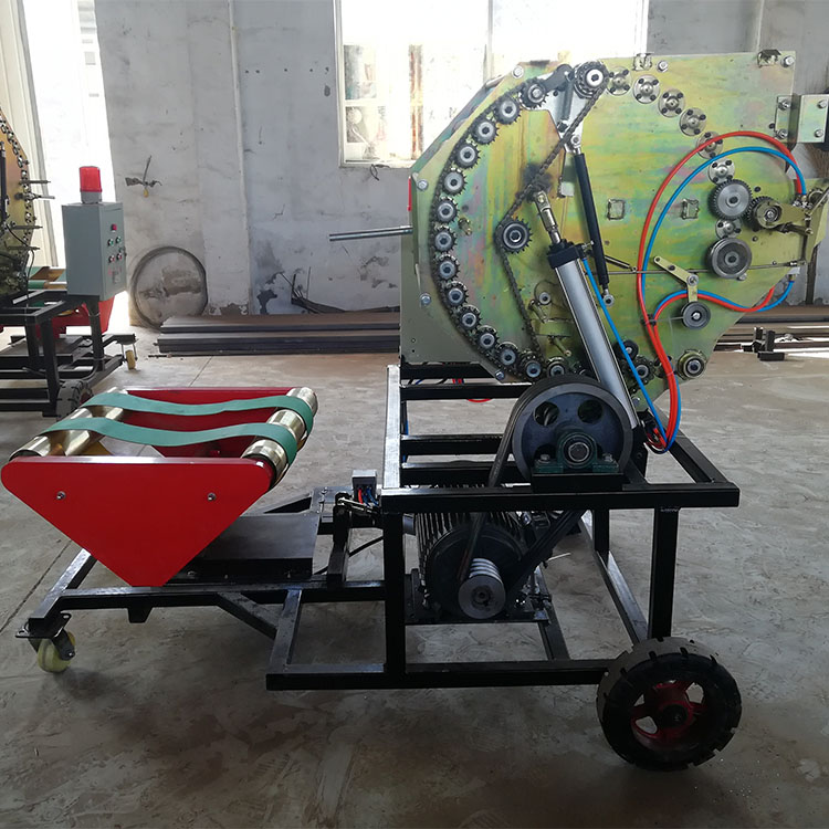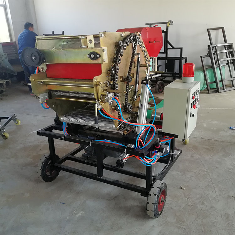 將揉搓好的飼草快速、勻速、均勻地送入打捆機(jī)的工作倉內(nèi),每梱重量達(dá)到50公斤(草捆重量可設(shè)置)左右時,信號勻速轉(zhuǎn)動,報(bào)警器會不停的報(bào)警,這時機(jī)器會自動繞繩并且停止送料,機(jī)器開始往復(fù)繞線捆扎,繞線機(jī)構(gòu)自動完成捆扎過程。當(dāng)捆扎完畢,線繩被切斷后,打捆機(jī)自動開倉出草捆。這時打捆工序完成。打捆完成后草捆自動滾落到包膜機(jī)兩平行皮帶之上,,草捆拉伸塑膜自行纏繞,并自動完成包膜工作。當(dāng)包膜工作完成設(shè)定包膜層數(shù)后(2層至4層),即自行停止,然后手動切斷牧草膜,然后人工腳踩踩踏閥,包好的草捆會自動翻滾過來,然后擺放整齊 贈送小推車和工具箱