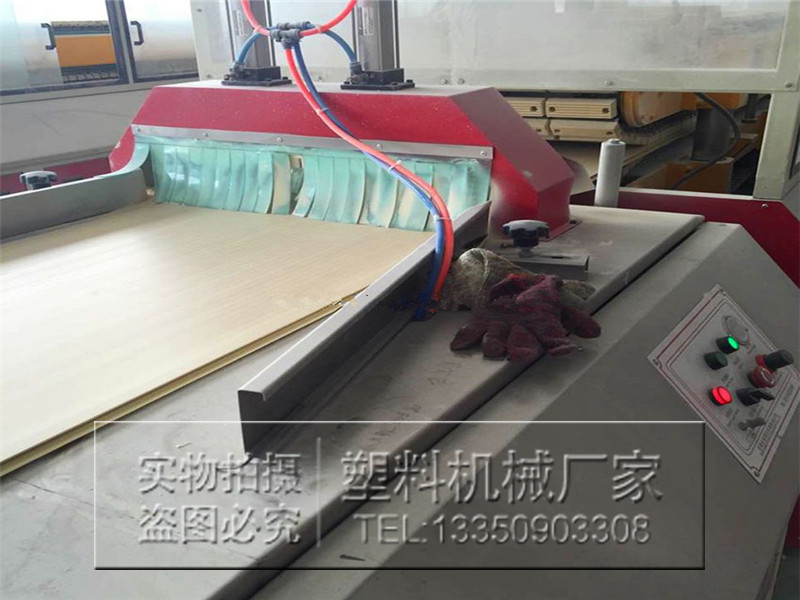 PVC護墻板生產(chǎn)線的生產(chǎn)工藝:原材料拌和混合干→將原材料上料至擠出機進行塑化擠出→擠出的護墻板通過擠出磨具定型→通過真空定型臺進行充分定型冷卻→由牽引機牽引往前傳送→依據(jù)設定由切割機切出相應長度的護墻板→放料架自動放料至運送小車→推送至包覆機進行包覆上色→完成后打包入庫進行市場銷售等工序。