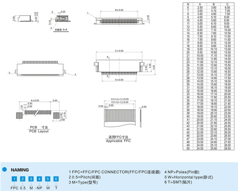 | 0.5mm間距 雙面接觸 臥貼式 H=2.0mm |