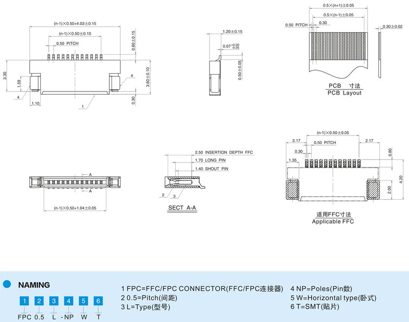 | 0.5mm間距 雙面接觸 臥式貼片 H=1.2mm fpc |