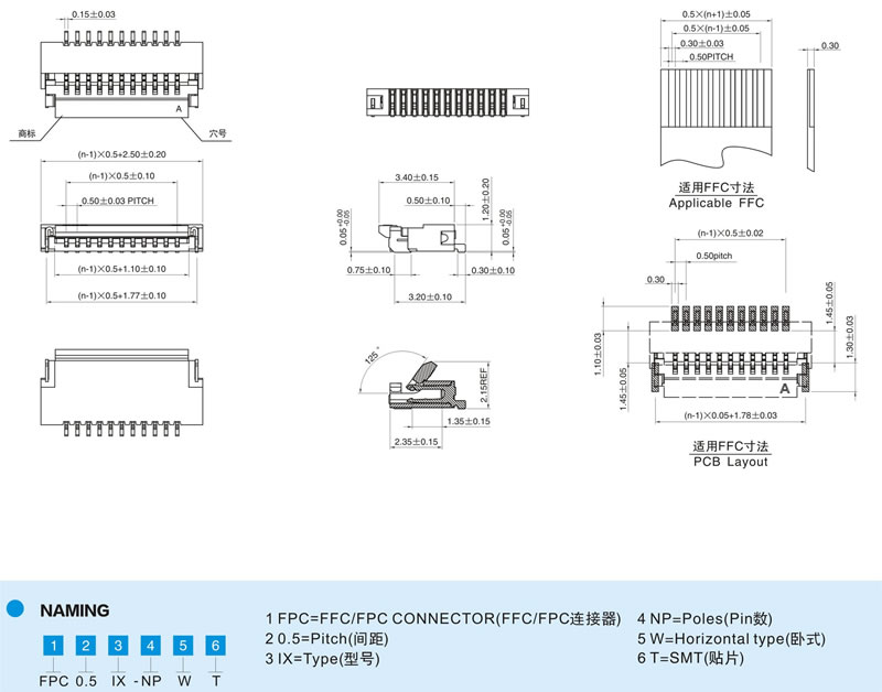 | 0.5mm間距 臥式貼片 上接觸 翻蓋式半包 |
