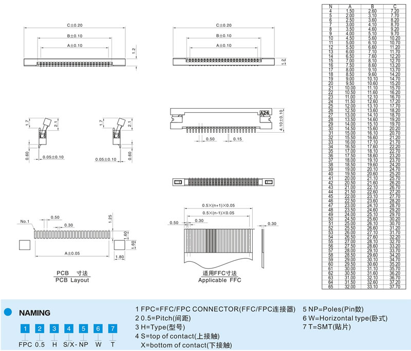| 0.5mm間距 臥式貼片 抽屜式上下接觸 H=1.2MM |