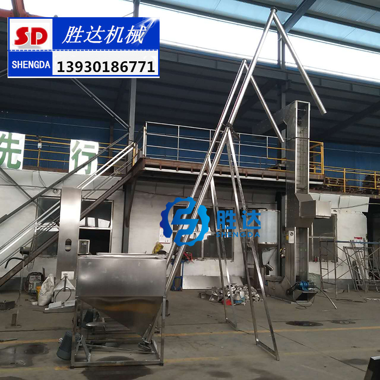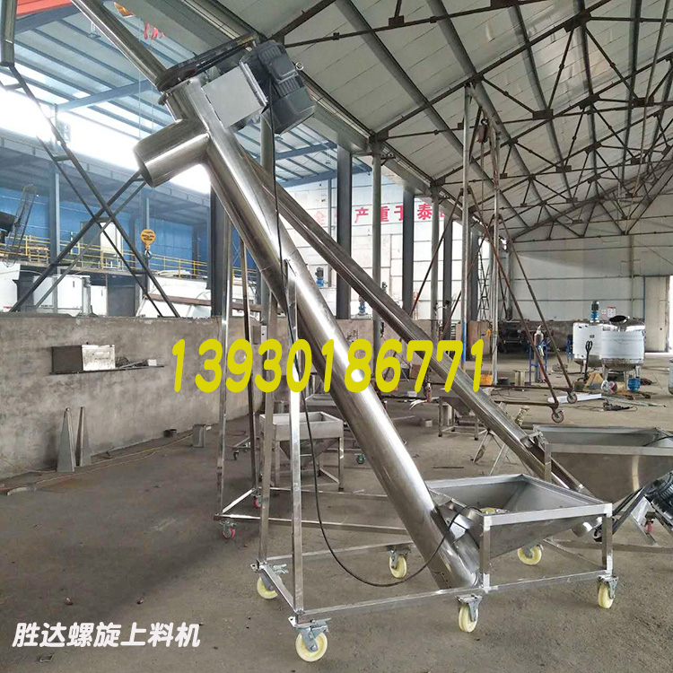 欒城縣勝達(dá)不銹鋼制品加工廠,專業(yè)的不銹鋼螺旋提升機(jī)/不銹鋼螺旋上料機(jī)生產(chǎn)廠家。我們生產(chǎn)的不銹鋼螺旋提升機(jī)/不銹鋼螺旋上料機(jī)料倉(cāng)帶有振動(dòng)電機(jī),上料更通暢;料管下端帶有放料門,且螺旋可反轉(zhuǎn)排料,排料、清洗方便。不銹鋼螺旋提升機(jī)(也稱為不銹鋼螺旋上料機(jī)、不銹鋼螺旋加料機(jī))主要和包裝機(jī)、混合機(jī)、攪拌機(jī)等相關(guān)設(shè)備配套使用,減少粉塵,減輕勞動(dòng)強(qiáng)度,提高勞動(dòng)效率。 常規(guī)不銹鋼螺旋提升機(jī)技術(shù)參數(shù) ●輸送高度: ?mm(特殊要求可定做) ●功率:AC380V AC220V ●整機(jī)重量: kg ●料倉(cāng)容量:100L ●輸送量:?m3/小時(shí) 參數(shù)說明:上料機(jī)是一款將物料由低至高的輸送設(shè)備,原則是節(jié)約人工降低物 料灑地、減低損耗浪費(fèi),此款垂直上料機(jī)是我公司根據(jù)場(chǎng)地緊湊的車間,盡量節(jié)約占地面積而設(shè)計(jì)的一款不銹鋼上料設(shè)備,可以把物料通過垂直輸送方式從低至高上料。 2.整機(jī)所有與物料接觸部分全部采用304不銹鋼制造,長(zhǎng)度設(shè)計(jì)范圍1米---12米均可定做,上料管直徑60MM—500毫米可根據(jù)客戶要求設(shè)計(jì),主軸電機(jī)功率根據(jù)客戶要求及物料選擇而定。 3.不銹鋼送料管內(nèi)壁與螺旋葉片間隙距離不大于3mm。螺旋葉片激光切割加工,所有焊接口拋光處理以達(dá)到光滑不殘留物料; 4.輸送料的速度在每小時(shí)100KG—15噸以上。 5.采用進(jìn)口萬(wàn)向軸承隔熱防塵設(shè)計(jì),上料機(jī)兩頭設(shè)計(jì)安裝有臺(tái)灣進(jìn)口油封,確保粉塵及雜物進(jìn)入軸承,以達(dá)經(jīng)久耐用的目的, 6.科學(xué)設(shè)計(jì):螺旋軸采用不銹鋼無(wú)縫管,經(jīng)車床校正,確保同心度,機(jī)器運(yùn)行穩(wěn)定,葉片全部采用不銹鋼材料。葉片采用加厚不銹鋼葉片。 7:底部設(shè)計(jì)有清料口,如需換料,只需要用風(fēng)槍吹下即可將小部分殘料清除。并在清料口出設(shè)計(jì)安全開關(guān),一旦開啟清料門即斷電,安全可靠。