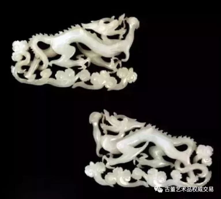 唐玉龍的造型特點是,身形細長彎轉,有脊梁線(或脊毛),滿刻陰線細斜格形鱗紋,蛇形尾;頭前長有分枝角(如鹿角),土耳,梭形眼,大張口,口角咧過眼后角,上唇長而尖,或有牙,下唇向上卷;四肢三爪足;尾從一后肢穿過。作奔騰狀,張牙舞爪,氣勢恢宏。龍紋多伴有云紋,若飛行于云間。追溯唐玉龍的生動美與氣勢美,當源自戰(zhàn)國玉龍,但唐玉龍較之更為精彩;因為,唐玉龍是在傳統(tǒng)各式玉龍基礎上發(fā)展變化而來,且造型特點極為突出。
