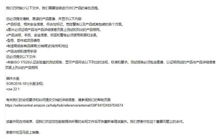 近日,亞馬遜平臺發(fā)布公告,要求在加拿大站銷售的所有電水壺必須有ISO 17025實(shí)驗(yàn)室出具的符合CSA22.1和SOR/2016-181標(biāo)準(zhǔn)的認(rèn)證證書。賣家們應(yīng)盡快上傳相關(guān)資料以避免產(chǎn)品被強(qiáng)制下架,截止日期為2023年10月30日。