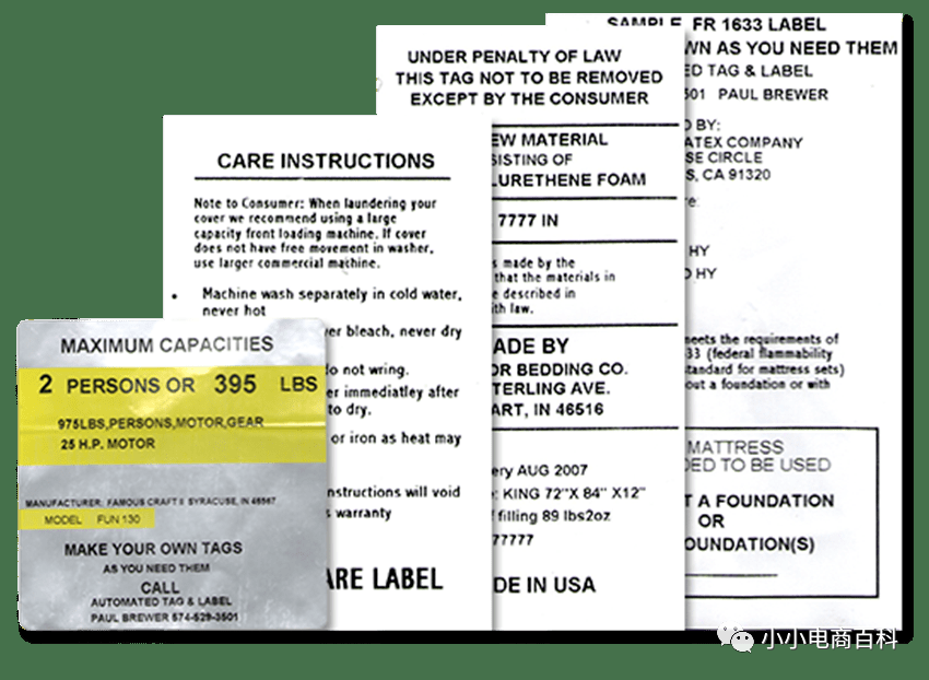 LAW LABEL法律標簽的定義 180法律標簽一般由耐損性比較強的高密度無紡布材料(特衛(wèi)強)制作,它為消費者提供有關產(chǎn)品的信息 -產(chǎn)品填充物料及其百分比,制造商資料和其他的相關信息.針3812 對寢具和家具相關產(chǎn)品, 法律標簽也會明確提示 “根據(jù)法律規(guī)定, 只有消費者可以移除法律標簽”. (UNDER PENALTY OF LAW THIS TAG NOT TO BE 5434 REMOVED EXCEPT BY CONSUMER)。 URN注冊是美國州法規(guī) 有標簽法的州并需要法律標law label注冊: 加利福尼亞州、康涅狄格州、特拉華州、底特律(密歇根州)、馬薩諸塞州、紐約州、北卡羅來納州、俄亥俄州、俄克拉荷馬州、賓夕法尼亞州、羅德島州、猶他州、弗吉尼亞州、西弗吉尼亞州 ? 有標簽法的州但不需要法律標law label注冊: 亞利桑那州、阿肯色州、科羅拉多州、哥倫比亞特區(qū)、佛羅里達州*、夏威夷州、伊利諾伊州、印第安納州、肯塔基州、明尼蘇達州、密蘇里州、內(nèi)華達州*、新罕布什爾州、新澤西州、田納西州、佛蒙特州、威斯康星州 * 僅限二手 ? 沒有標簽法的州 阿拉巴馬州、阿拉斯加州、喬治亞州、愛達荷州、愛荷華州、堪薩斯州、路易斯安那州、緬因州、馬里蘭州、密歇根州、密西西比州、蒙大拿州、內(nèi)布拉斯加州、新墨西哥州、北達科他州、俄勒岡州、波多黎各、南卡羅來納州、南達科他州、德克薩斯州、維爾京群島、華盛頓、懷俄明州 ? 有標簽法的州并要求全新產(chǎn)品需要附上法律標 亞利桑那州、阿肯色州、加利福尼亞州、科羅拉多州、特拉華州、底特律(密歇根州)、哥倫比亞特區(qū)、夏威夷、印第安納州、肯塔基州、馬薩諸塞州、明尼蘇達州、密蘇里州、新罕布什爾州、新澤西州、紐約州、北卡羅來納州、俄亥俄州、俄克拉荷馬州、賓夕法尼亞州、羅德州島嶼,田納西州,德克薩斯州,猶他州,佛蒙特州,弗吉尼亞州,西弗吉尼亞州,威斯康星州 ? 有標簽法的州并要求二手產(chǎn)品需要附上法律標 亞利桑那州、加利福尼亞州、康涅狄格州、特拉華州、佛羅里達州、伊利諾伊州、印第安納州、馬里蘭州、馬薩諸塞州、密蘇里州、新罕布什爾州、新澤西州、紐約州、內(nèi)華達州、北卡羅來納州、俄亥俄州、俄克拉荷馬州、賓夕法尼亞州、羅德島州、田納西州、德克薩斯州、猶他州、佛蒙特州, 弗吉尼亞州, 西弗吉尼亞州, 威斯康星州 注意:據(jù)我們所知,此列表是最新的,并在收到有關任何狀態(tài)的變化狀態(tài)及其要求的新信息時立即更新。 需要law label法律標注冊的產(chǎn)品