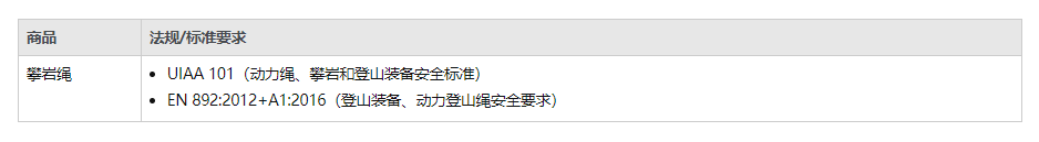 攀巖繩如果您在亞馬遜商城發(fā)布商品,則必須遵守適用于這些商品和商品信息的所有聯(lián)邦、州和地方法律以及我們的政策(包括本政策)。 本政策適用的攀巖繩 攀巖繩是與攀巖安全帶和錨點(diǎn)(例如:墻壁、巖壁或山壁)相連的一件器械。攀巖繩用于防止攀巖者墜落。攀巖繩通常由長捻纖維芯和編織彩色纖維外護(hù)套組成。 我們的攀巖繩政策 根據(jù)亞馬遜要求,所有攀巖繩均應(yīng)經(jīng)過檢測,并且符合下列特定法規(guī)或標(biāo)準(zhǔn)要求: