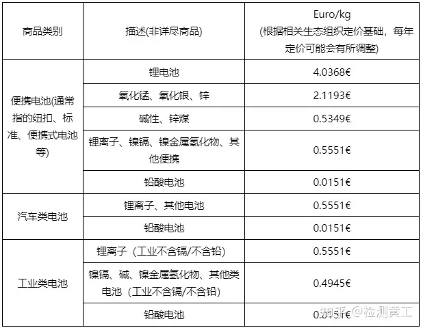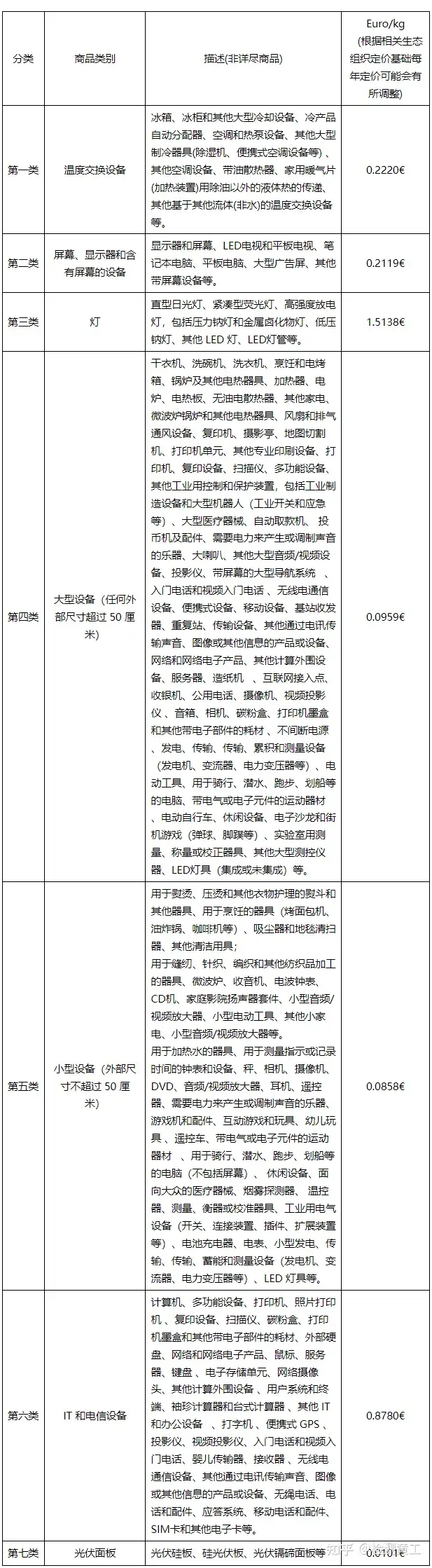 商品范圍及生態(tài)貢獻費的單位成本:根據(jù)西班牙法規(guī)和生態(tài)環(huán)保組織要求,電氣電子設備、電池和蓄電池所涵蓋的商品范圍及單位成本如下表。
