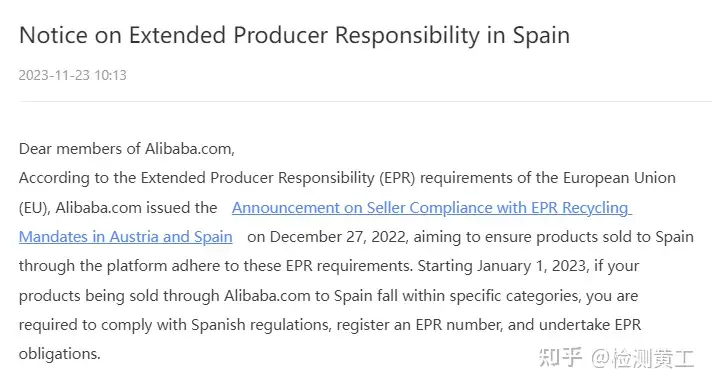 近日阿里巴巴國際站發(fā)布西班牙生產(chǎn)者責任延伸(EPR)公告,公告如下: