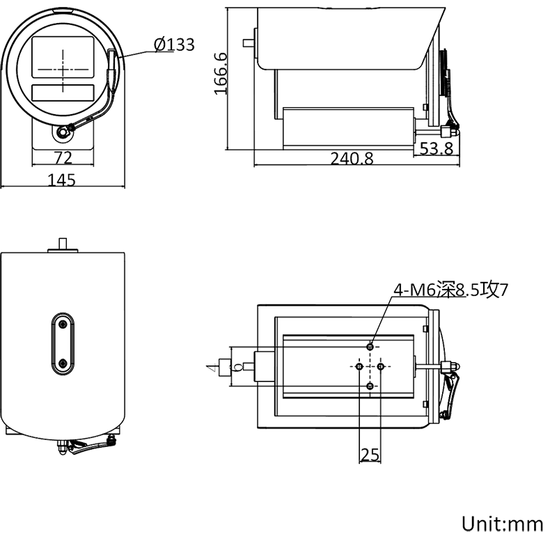 DS-2XC6846-IZRS 海康威視400萬(wàn)透塵透水汽攝像機(jī) 功能特性: 嵌入式開(kāi)發(fā)攝像機(jī),圖像效果,豐富易用接口,方便第三方算法植入與承載 開(kāi)放應(yīng)用平臺(tái):支持4個(gè)第三方應(yīng)用程序,可共享算力、內(nèi)存、存儲(chǔ)等設(shè)備資源 開(kāi)放應(yīng)用平臺(tái):支持4T INT8算力、4 GB DDR4滿(mǎn)足高帶寬需求(150 MB系統(tǒng)內(nèi)存、1800 MB智能內(nèi)存,供第三方使用)、內(nèi)存8 GB EMMC存儲(chǔ)(1288 MB存儲(chǔ),供第三方使用) 開(kāi)放應(yīng)用平臺(tái):支持底層庫(kù)調(diào)用共享。BASE庫(kù):可以提供提供編碼后的視頻流、參數(shù)配置透?jìng)魍ǖ、?bào)警及智能結(jié)構(gòu)化數(shù)據(jù)等接口;BSC庫(kù):可以提供YUV原始數(shù)據(jù)流、圖像縮放、JPEG編碼,內(nèi)存拷貝等接口;HIKFLOW庫(kù):可以提供提供圖像加速庫(kù)、智能推理庫(kù)等 圖像相關(guān):分辨率可達(dá)400萬(wàn)像素,并在此分辨率下可輸出30 fps實(shí)時(shí)圖像,圖像更流暢;支持透霧、電子防抖;支持寬動(dòng)態(tài)120 dB 采用高效紅外陣列燈,低功耗,照射距離最遠(yuǎn)達(dá)30 m 支持雨刷 (配毛刷,需自行更換) 支持防雷、防浪涌、防靜電,IP68防護(hù)等級(jí) 材質(zhì):不銹鋼316L外殼 DS-2XC6846-IZRS ?低400萬(wàn)透塵透水汽攝像機(jī) 規(guī)格參數(shù): 傳感器類(lèi)型:1/1.8" Progressive Scan CMOS 照度:彩色:0.0005 Lux @(F1.2,AGC ON) 黑白:0.0001 Lux @(F1.2,AGC ON),0 Lux with IR 寬動(dòng)態(tài):120 dB 焦距&視場(chǎng)角:2.8~12 mm:水平視場(chǎng)角:107.3°~39.8°,垂直視場(chǎng)角:55.9°~22.3°,對(duì)角視場(chǎng)角:129.9°~45.7° 補(bǔ)光燈類(lèi)型:紅外燈 補(bǔ)光距離:30 m 紅外波長(zhǎng)范圍:850 nm 圖像尺寸:2560 × 1440 視頻壓縮標(biāo)準(zhǔn):主碼流:Smart265/H.265/Smart264/H.264 子碼流:H.265/H.264/MJPEG 第三碼流:H.265/H.264 網(wǎng)絡(luò):1個(gè)RJ45 10 M/100 M/1000 M自適應(yīng)以太網(wǎng)口 SD卡擴(kuò)展:內(nèi)置MicroSD/MicroSDHC/MicroSDXC插槽,支持256 GB 音頻:1路輸入(Line in),1路輸出(Line out) 報(bào)警:1路輸入,1路輸出(報(bào)警輸出支持DC12V 30mA) 外殼材質(zhì):316L 產(chǎn)品尺寸:240.9 × 145 × 166.6 mm 設(shè)備重量:4915 g 帶包裝重量:5575 g 啟動(dòng)和工作溫濕度:-30 °C~60 °C,濕度小于95%(無(wú)凝結(jié)) 電流及功耗:DC:12 V ± 20%,1.2 A,功耗:16 W PoE:802.3at,42.5 V~57 V,0.4A-0.3A,功耗:16 W 供電方式:DC:12 V ± 20% PoE:802.3at,42.5 V~57 V 電源接口類(lèi)型:3芯接口 恢復(fù)出廠設(shè)置:支持 防護(hù):IP68 DS-2XC6846-IZRS ?低400萬(wàn)透塵透水汽攝像機(jī) 產(chǎn)品尺寸: