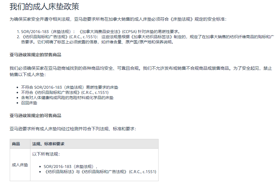 二、核心合規(guī)要求1. 阻燃性能測試(香煙測試) 床墊需通過CAN/CGSB-4.2 No.27.7標準規(guī)定的香煙測試,具體要求包括: 測試條件:在溫度21℃±3℃、濕度35%-50%、風速<0.3米/秒的環(huán)境下進行。 判定標準: 香煙點燃后,床墊表面炭化或熔融長度不得超過50毫米; 香煙熄滅后10分鐘內,床墊不得繼續(xù)燃燒。 樣品處理:若床墊硬度不足(硬度計讀數<75),需添加聚氨酯泡沫層以達到測試要求。 2. 紡織品標簽規(guī)范 根據《紡織品貼標和廣告法規(guī)》(C.R.C., c.1551),床墊標簽需明確標注以下信息: 纖維成分、原產國、保養(yǎng)說明; 符合SOR/2016-183的合規(guī)聲明。 3. 禁售與召回管理 禁止銷售未通過阻燃測試、標簽不全或含危險化學物質的床墊; 被召回的床墊不得重新上架。 三、亞馬遜平臺的特殊要求針對加拿大站賣家,亞馬遜進一步規(guī)定: 文件提交:需提供由ISO 17025認證實驗室出具的檢測報告,證明符合SOR/2016-183和紡織品標簽法規(guī)。 商品詳情頁信息:必須包含材料說明、合規(guī)聲明、安全警告及標簽內容。 違規(guī)后果:未按時提交合規(guī)文件的商品將面臨下架風險。