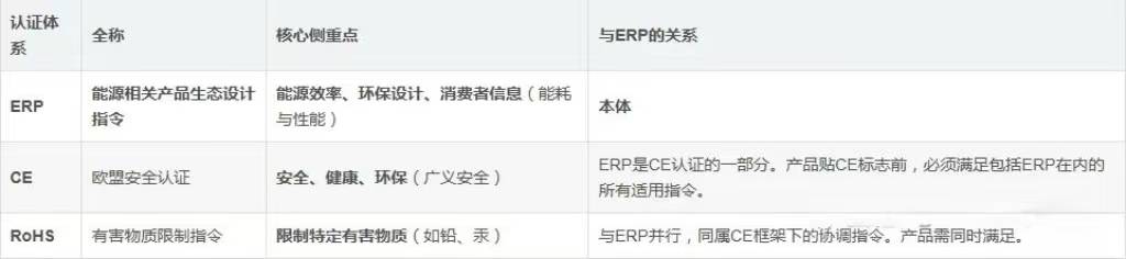 ERP(Energy-related Products)即能源相關(guān)產(chǎn)品生態(tài)設(shè)計(jì)指令,是歐盟針對(duì)能源消耗產(chǎn)品制定的強(qiáng)制性能合規(guī)體系,屬于CE認(rèn)證框架的重要組成部分。它不是單一證書,核心包含兩大要求: