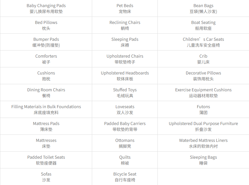 什么是Law Label? Law Label誕生于19世紀初期,其應用旨在告知消費者在床上用品和軟體家具里面“看不見”的填料成分,英文叫做“Stuffed/Filling Materials”。它是一張具有法律效力的標簽固定在產品上,用來描述床墊,軟體家具和軟填充物如枕頭,抱枕,毛絨玩具等的布料和填料成分/比例。除非是消費者自身行為,否則該標簽在流通,銷售過程中不得在產品上移除。 Law Label相關測試服務包括: CA TECHNICAL BULLETIN 117 Requirements, Test Procedure and Apparatus for Testing the Smolder Resistance of Materials Used in Upholstered Furniture 軟體家具材料悶燒測試 16 CFR 1632 Standard for the Flammability of Mattresses and Mattress Pads (FF 4-72, Amended) 床墊,床襯墊的香煙悶燒測試標準 16 CFR 1633 Standard for the Flammability (Open Flame) of Mattress Sets 床墊/床托的明火阻燃測試要求及測試程序 CA Prop 65 阻燃劑含量