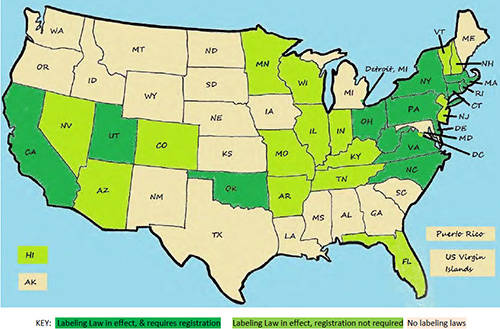 法規(guī)要求 目前美國的32個州和加拿大的魁北克省,安大略省,馬尼托巴省都強制規(guī)定床上用品和軟體家具必須張貼Law Label,但每個州/省對管轄的產品和Law Label的要求不盡相同。所以,如果需要申請多個州/省的law label和TSSA注冊以及后期證書維護,無論是費用或時間以及對操作人員的要求都是一個嚴峻的挑戰(zhàn)。