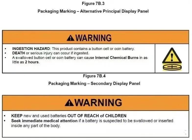 ③如果產(chǎn)品本體空間不足以容納標(biāo)簽 Figure 7C.1 或 Figure 7C.2: ●產(chǎn)品包裝應(yīng)符合包裝警告標(biāo)簽要求。 ●或采用吊牌方式包含完整的包裝警告標(biāo)簽要求。 4、警告標(biāo)簽(包裝) 注意:無論產(chǎn)品本體是否有足夠空間,包裝上均應(yīng)附有警告標(biāo)簽。 包裝警告標(biāo)簽要求: 如果包裝主空間足夠,使用 Figure 7B.1 或 Figure 7B.2: