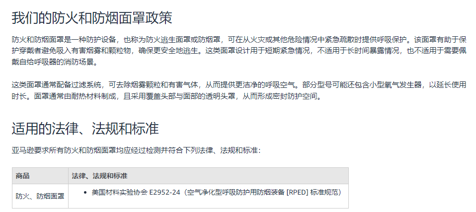 美國防火防煙面罩的檢測標準主要依據(jù) ASTM E2952 系列標準,該標準是亞馬遜等電商平臺及北美市場強制要求的合規(guī)依據(jù),適用于空氣凈化型呼吸防護用防煙裝備(RPED),旨在為火災逃生提供15分鐘的有限防護。 防火和防煙面罩是一種防護設備,也稱為防火逃生面罩或防煙罩,可在從火災或其他危險情況中緊急疏散時提供呼吸保護。該面罩有助于保護穿戴者避免吸入有害煙霧和顆粒物,確保更安全地逃生。這類面罩設計用于短期緊急情況,不適用于長時間暴露情況,也不適用于需要佩戴自給呼吸器的消防場景。